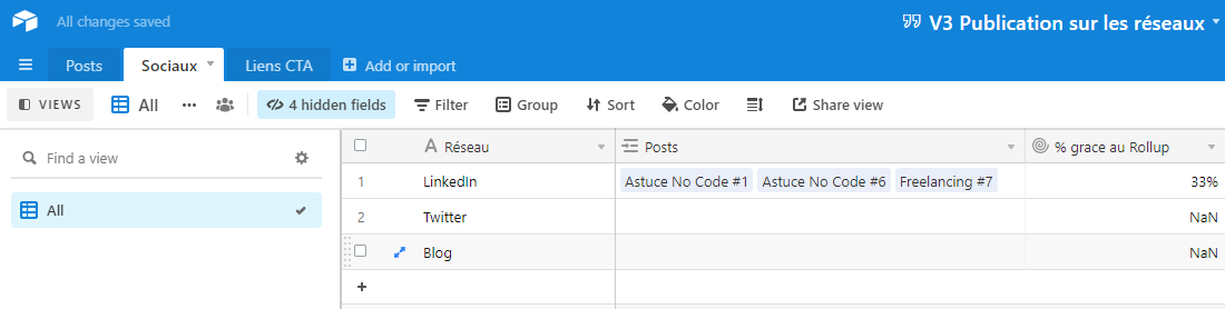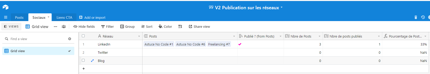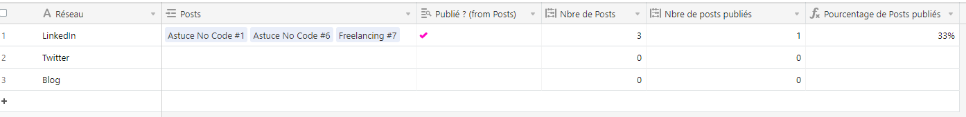 - Sur une autre Table Réseaux, je souhaite obtenir le nombre de posts publiés sur le total de posts concernés par ce réseau, en pourcentage ?