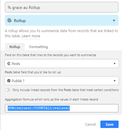 On va donc créer un champs Roll-up pour effectuer une opération sur un record et afficher le résultat dans une table liée.