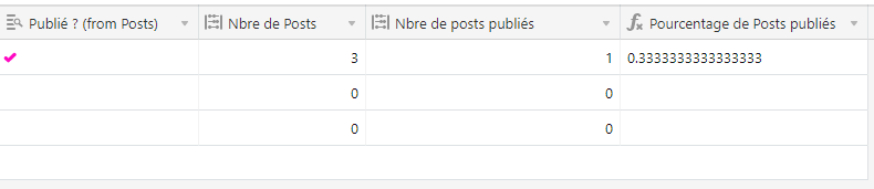 Maintenant, pour afficher le % de posts publiés / Total de posts, on pourrait faire :
