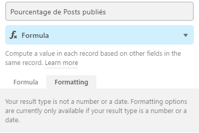 A travers cette formule, le résultat possible est un texte si la condition est “fausse” car notre ““ pour laisser vide le champs, Airtable le traduit comme du texte… vide.